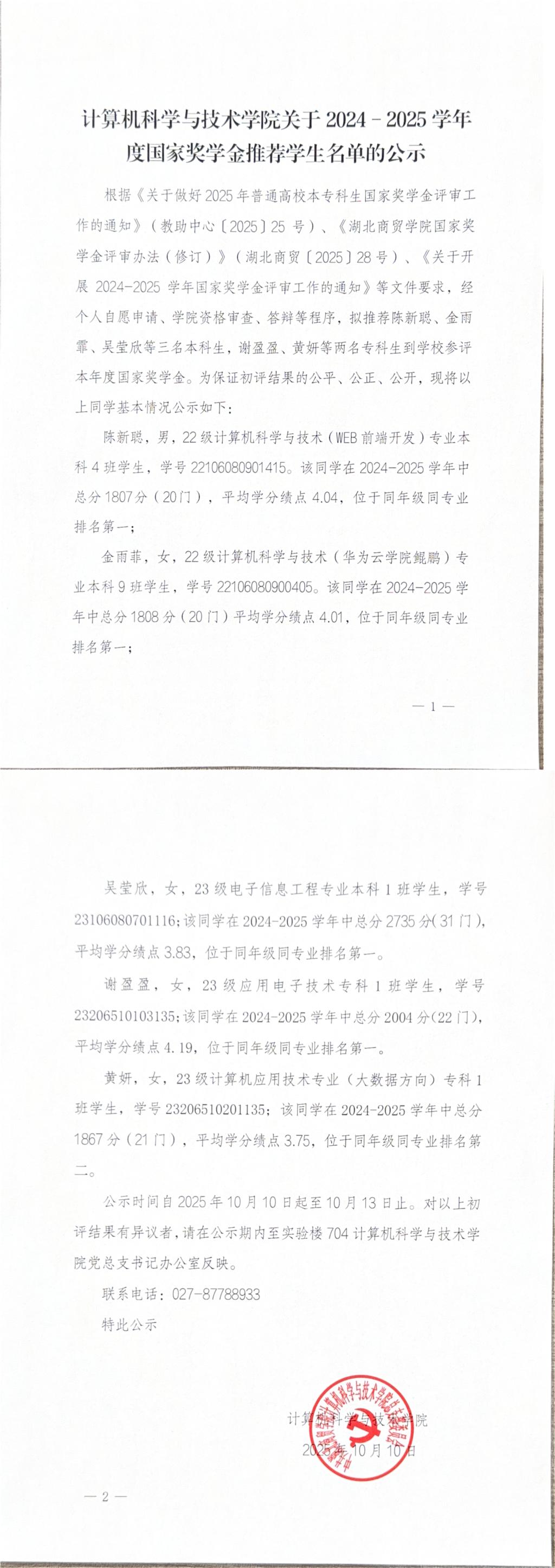根据《关于做好2025年普通高校本专科生国家奖学金评审工作的通知》(教助中心〔2025〕25 号)、《湖北商贸学院国家奖学金评审办法(修订)》(湖北商贸〔2025〕28号)、《关于开展 2024-2025 学年国家奖学金评审工作的通知》等文件要求,经个人自愿申请、学院资格审查、答辩等程序,拟推荐陈新聪、金雨霏、吴莹欣等三名本科生,谢盈盈、黄妍等两名专科生到学校参评本年度国家奖学金。为保证初评结果的公平、公正、公开,现将以上同学基本情况公示如下: