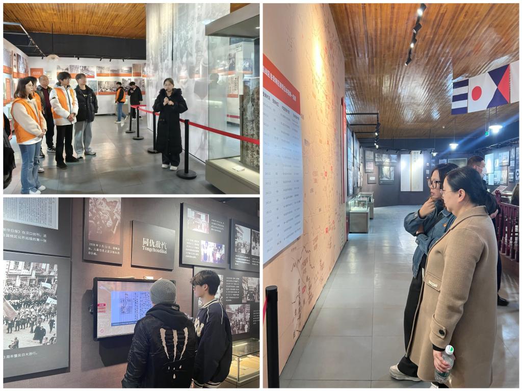 在讲解员的带领下,师生党员怀着无比崇敬的心情走进受降堂。展厅内,300余幅泛黄的历史照片、近50件珍贵的抗战实物及复制品,串联起“浴血十四载”“武汉抗战”“持久抗战”“受降光复”的完整脉络。从武汉民众“献金救国”的热忱身影,到新四军在鄂豫边区的游击作战痕迹;从日军侵华的暴行铁证,到受降仪式的庄严场景,每一件文物都诉说着烽火岁月的艰辛,每一幅影像都定格着民族抗争的不屈。在受降仪式复原场景前,师生们驻足凝视,木质桌椅、人物姿态皆依史料复刻,仿佛能真切感受到当年日军将领递降书时的颤抖,以及国人洗雪国耻的激昂与振奋,深刻体悟到“胜利来之不易,和平值得珍视”的厚重内涵。