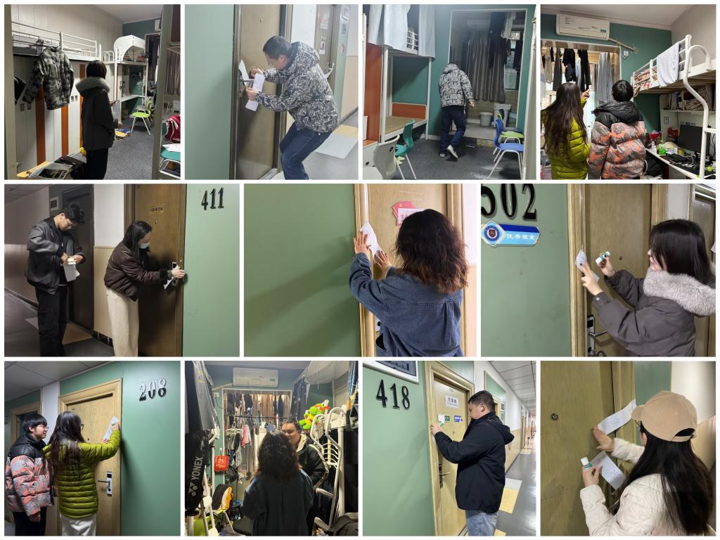 全体辅导员对宿舍逐一开展检查并张贴封条。工作过程中,辅导员们认真核对宿舍人员的离校情况,仔细检查宿舍门窗是否关好、水电是否关闭,以及是否存在安全隐患。在确认宿舍安全无误后,辅导员们将封条平整地张贴于宿舍门锁处。