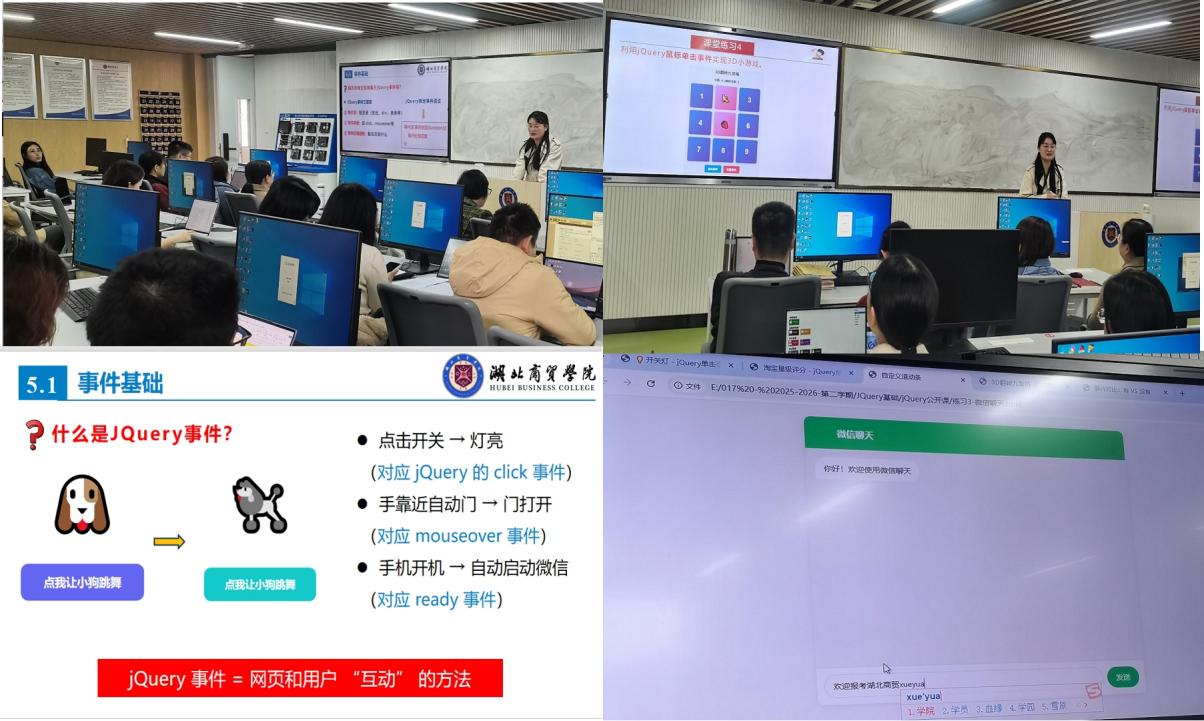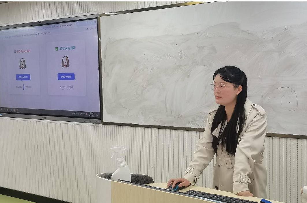 活动中,徐娇紧扣课程核心,围绕JQuery事件知识点,以淘宝评价、微信聊天、3D小游戏等演示实例引申出JQuery事件就是网页和用户“互动”的方法,指出JQuery事件的三要素:事件源、事件类型和事件处理函数,深入浅出的讲解了事件基础的基本概念,逐步铺陈讲解并进行代码演示,充分展现了青年教师的教学活力与专业素养。