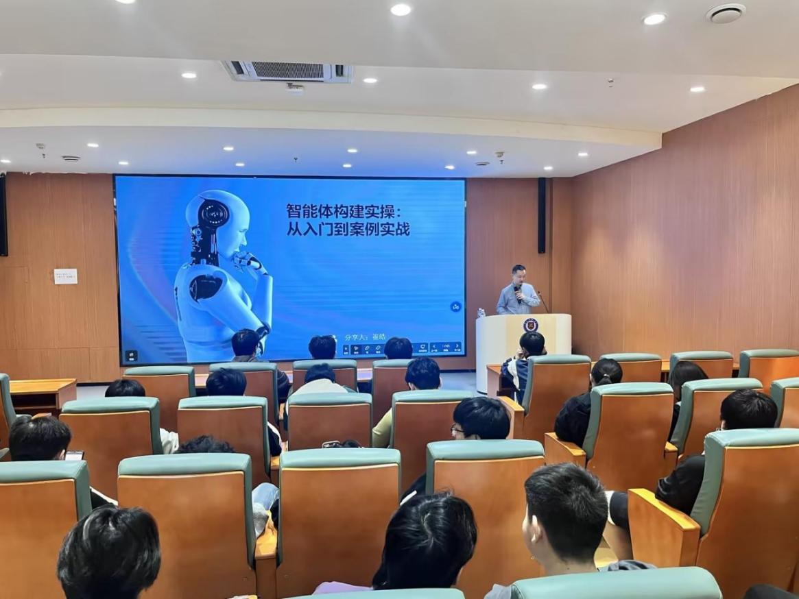 讲座核心环节聚焦实操演练,崔皓现场演示了基于主流平台的智能体搭建步骤——从结构化提示词设计,到知识库接入、工具集成与部署上线,每一步都细致讲解并解答学生疑问。随后,他结合智能体全场景协同、智能决策等真实项目案例,展示了智能体在复杂业务场景中的落地逻辑,让学生直观感受到技术与产业需求的结合点。