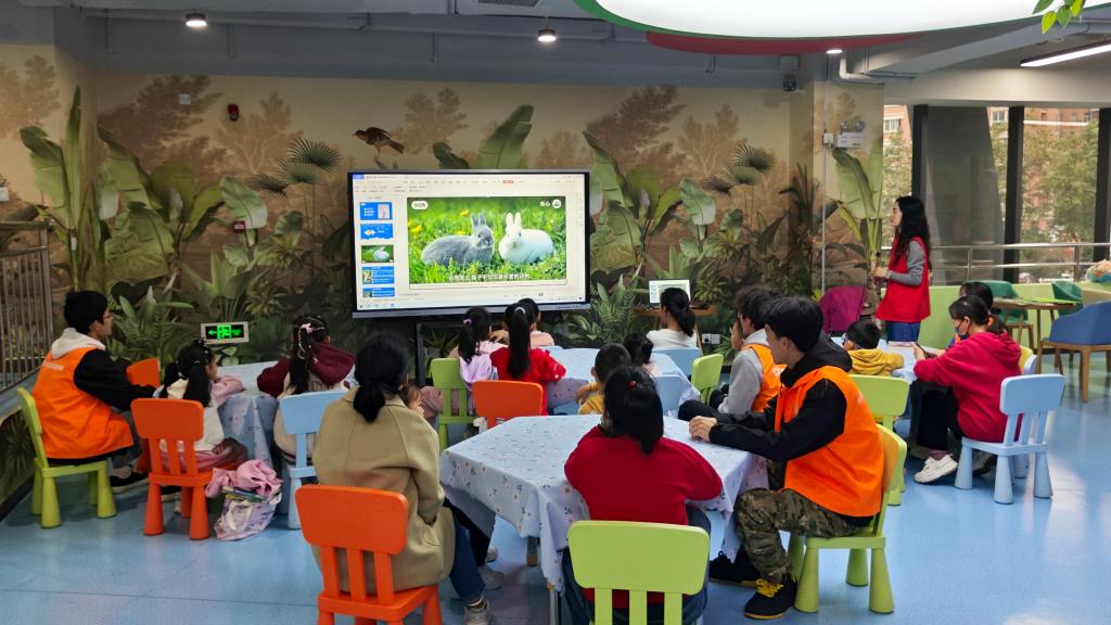 手工环节结束后,志愿者与孩子们围坐在一起,开展“兔子故事分享会”。孩子们戴着自己制作的兔子面具,轮流分享从书中读到的兔子故事,或复述绘本情节,或创编全新结局。