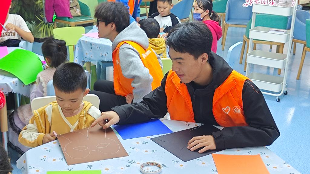 “大家先沿着画好的轮廓慢慢剪,注意不要剪到小兔子的长耳朵哦!”志愿者手把手示范折纸、描边、裁剪、粘贴等剪纸技巧,耐心指导孩子们根据自己的想象,用画笔为兔子面具添上圆眼睛、红腮红,还创意搭配蝴蝶结、星星等装饰。孩子们专注投入,有的复刻绘本里的“经典兔”,有的设计出戴帽子的“个性兔”,不时举起半成品向志愿者请教,现场充满欢声笑语。