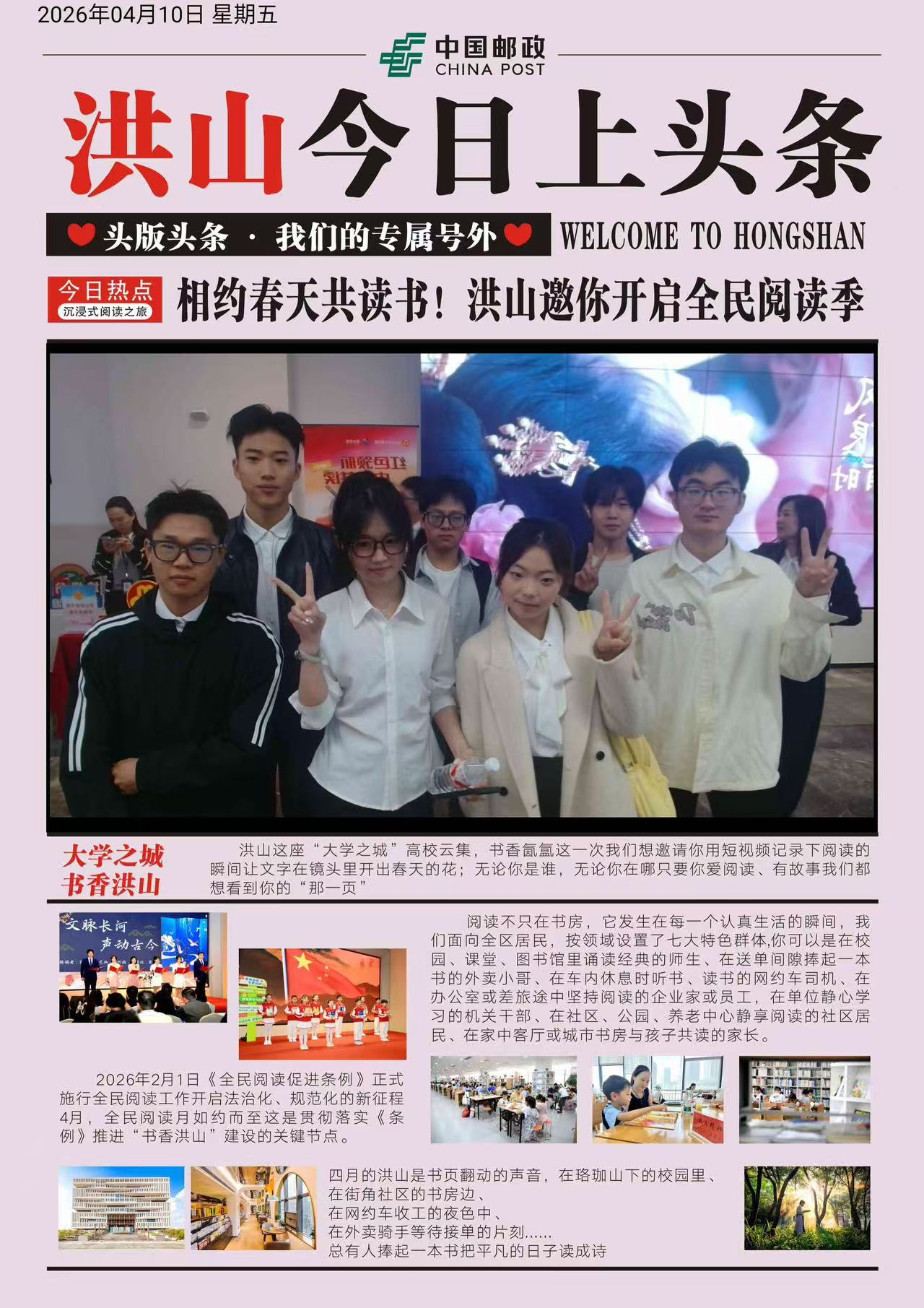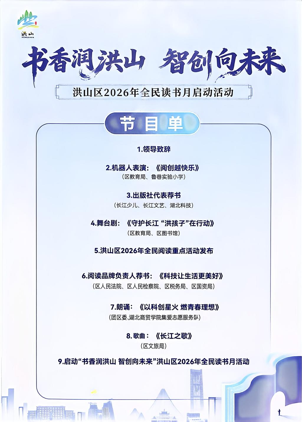 4月10日,在第31个世界读书日即将到来之际,由洪山区委宣传部、区教育局、区文化和旅游局主办,区图书馆、区融媒体中心、武汉洪山科创产业发展有限公司、中国邮政集团有限公司武汉市洪山区分公司、武汉新华书店洪山书店承办,以“书香润洪山 智创向未来”为主题的洪山区2026年全民读书月活动在洪山科创大厦正式启动。湖北商贸学院计算机科学与技术学院集爱志愿服务队作为洪山区青年志愿服务的骨干力量,受邀参加启动仪式并呈现精彩节目,赢得现场热烈反响