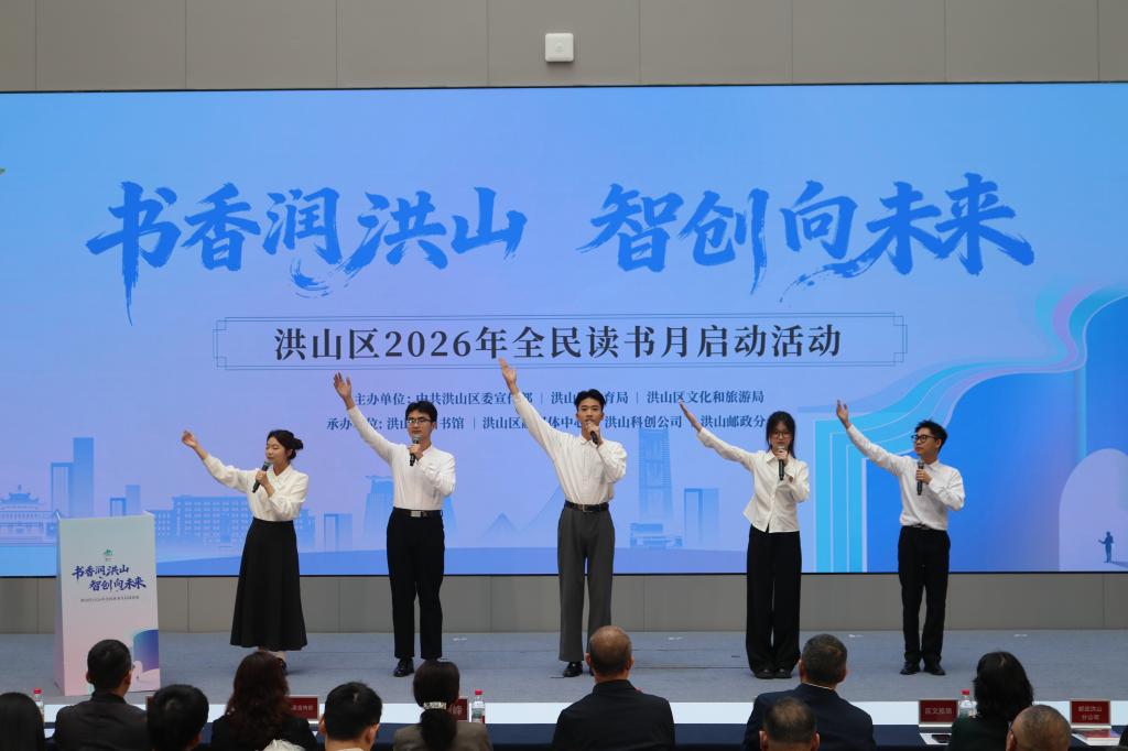 启动仪式上,湖北商贸学院集爱志愿服务队的大学生志愿者们带来诗朗诵《以科创星火燃青春理想》。志愿者们以饱含深情的演绎,展现了新时代青年学子扎根洪山“山水硅巷”建设、投身全民阅读推广的科创梦想与实干担当,将阅读与科技创新的时代主题融入铿锵有力的青春誓言之中,赢得现场阵阵掌声。与此同时,鲁巷实验小学带来机器人表演《阅创越快乐》,“洪孩子”们演绎了舞台剧《守护长江“洪孩子”在行动》,生动展现了不同群体参与全民阅读的热情与风采